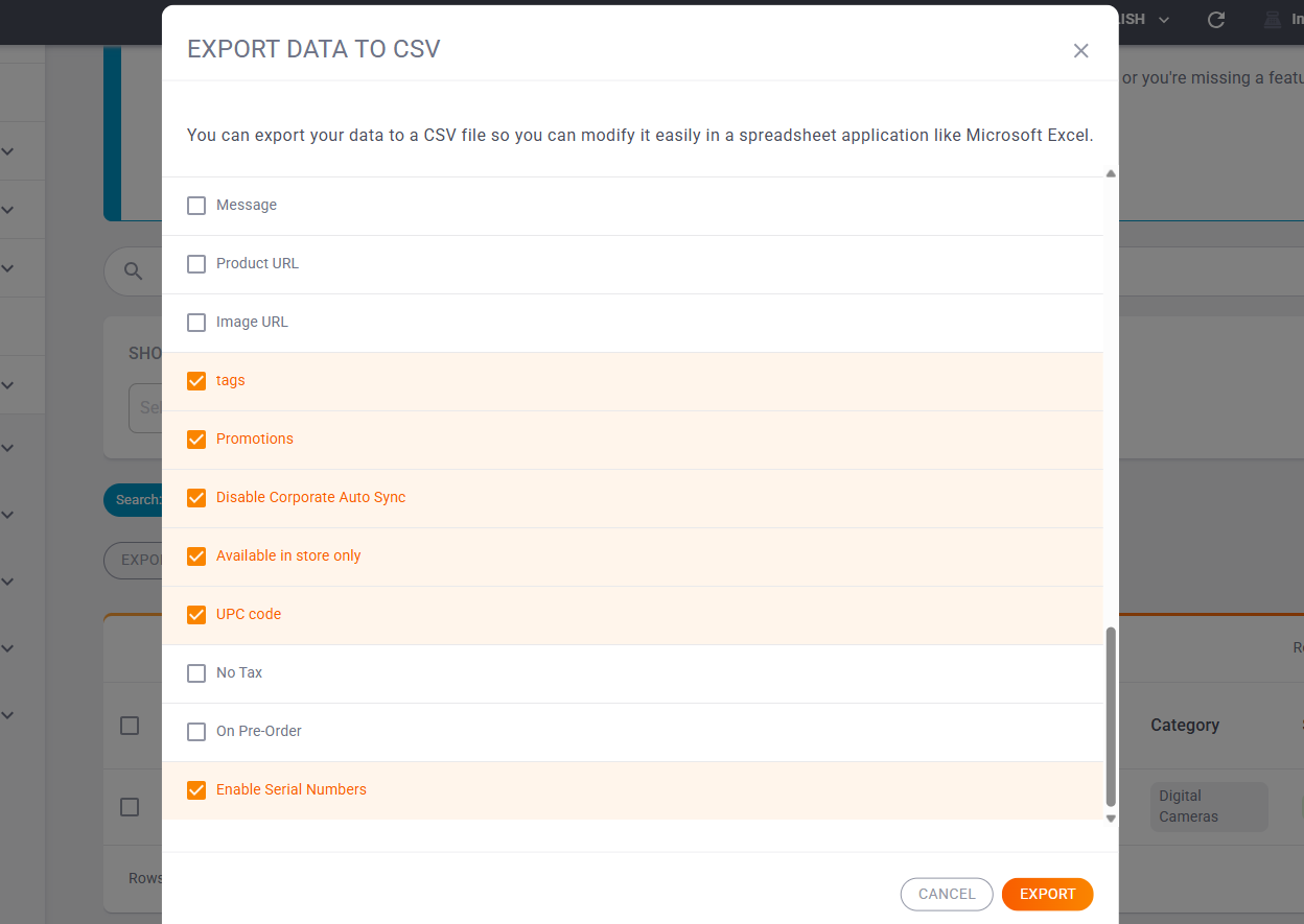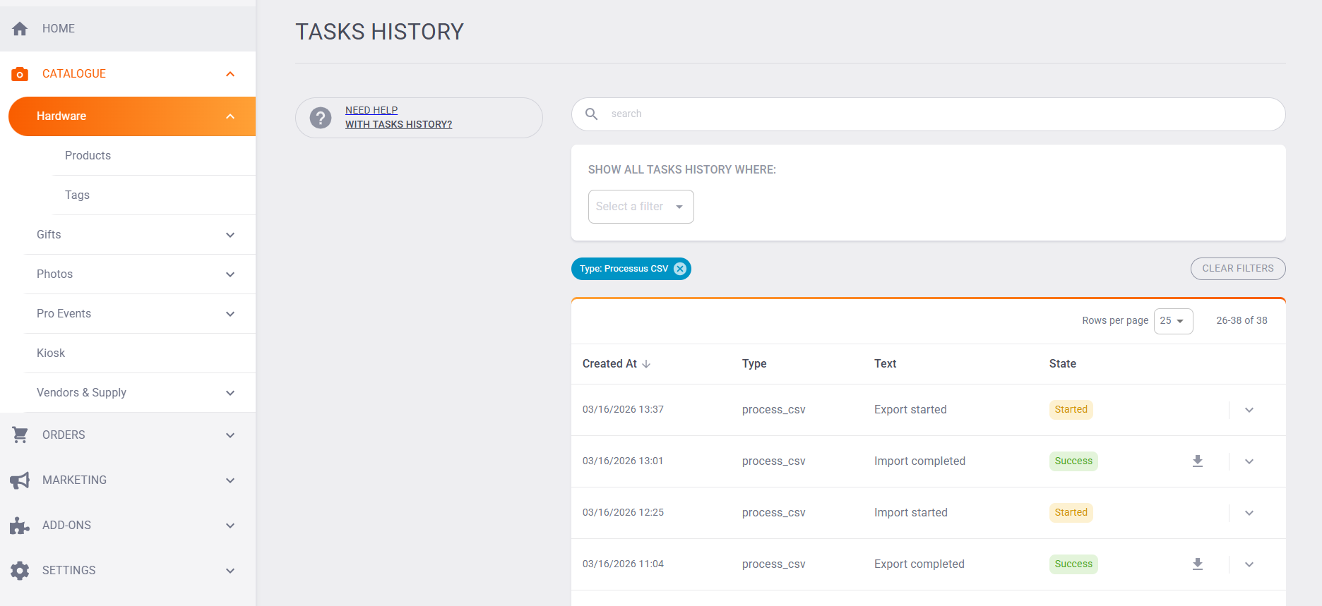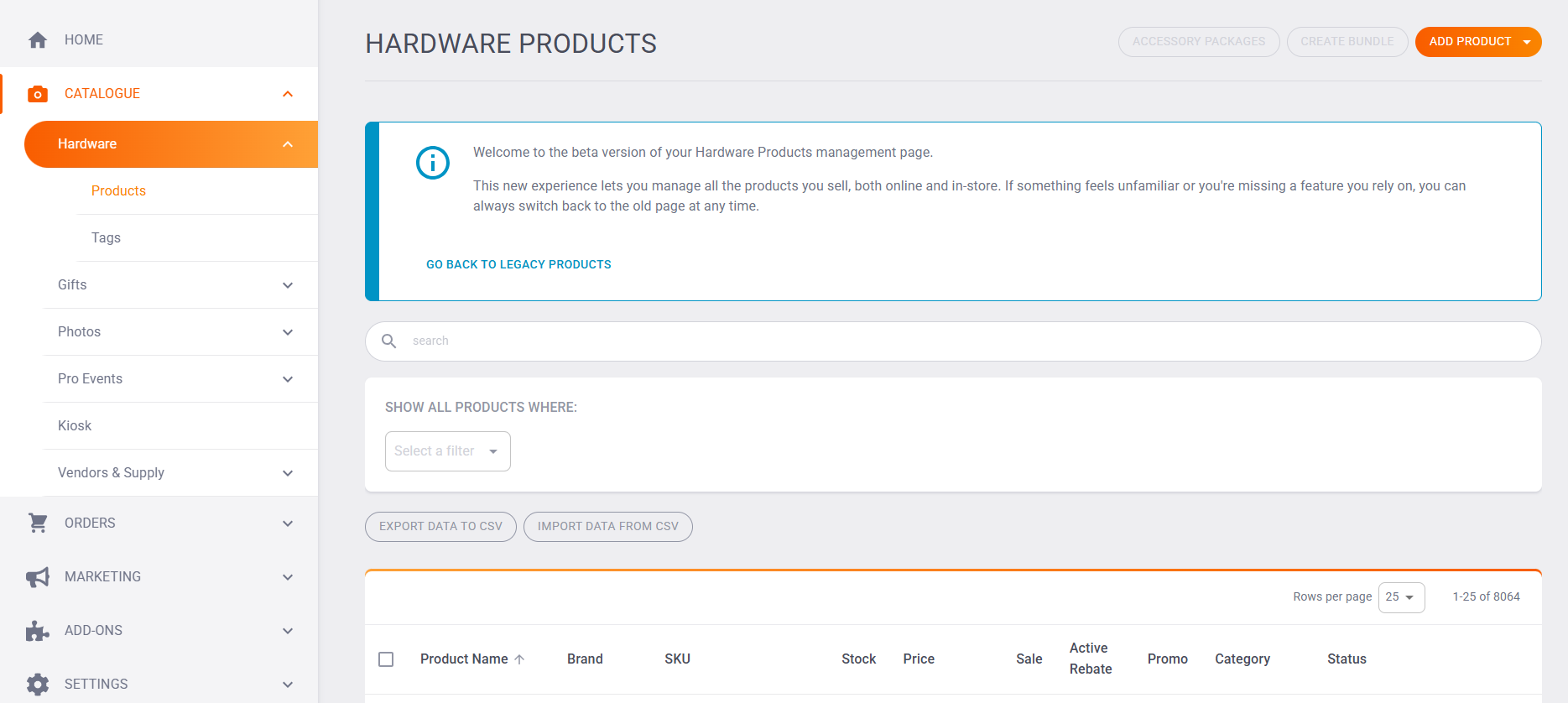 Your hardware products, cameras, accessories, and all other merchandise you sell online or in store, can be exported from the Hardware Products page.
